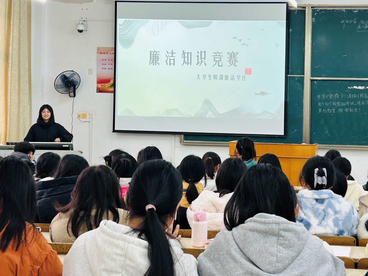 12月2日,大学生明湖廉洁学社在三教308教室举办“扬清风 强正气”廉洁知识竞赛活动,来自各教学学院50余名同学参加。